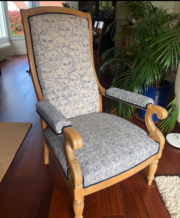 Fauteuil Voltaire aux mille visages – restauration traditionnelle (crin & ressorts) tissu ameublement