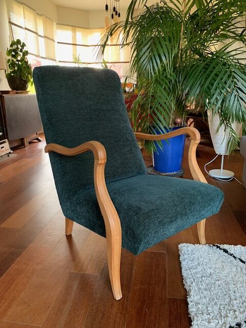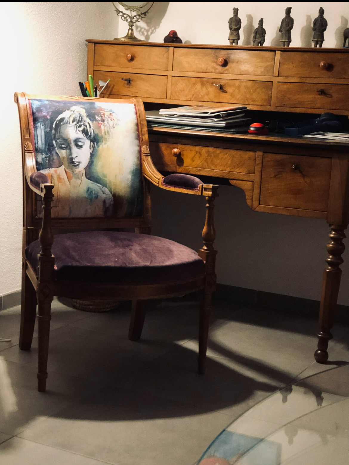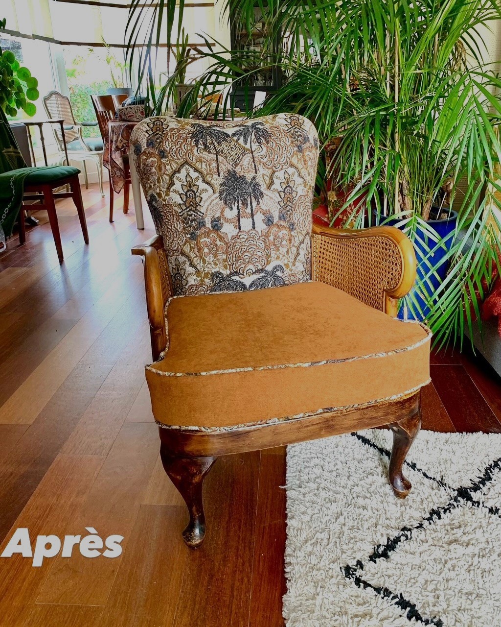 Chaise Louis XV (ma première réfection), restauration contemporaine en mousse HR tissu ameublement