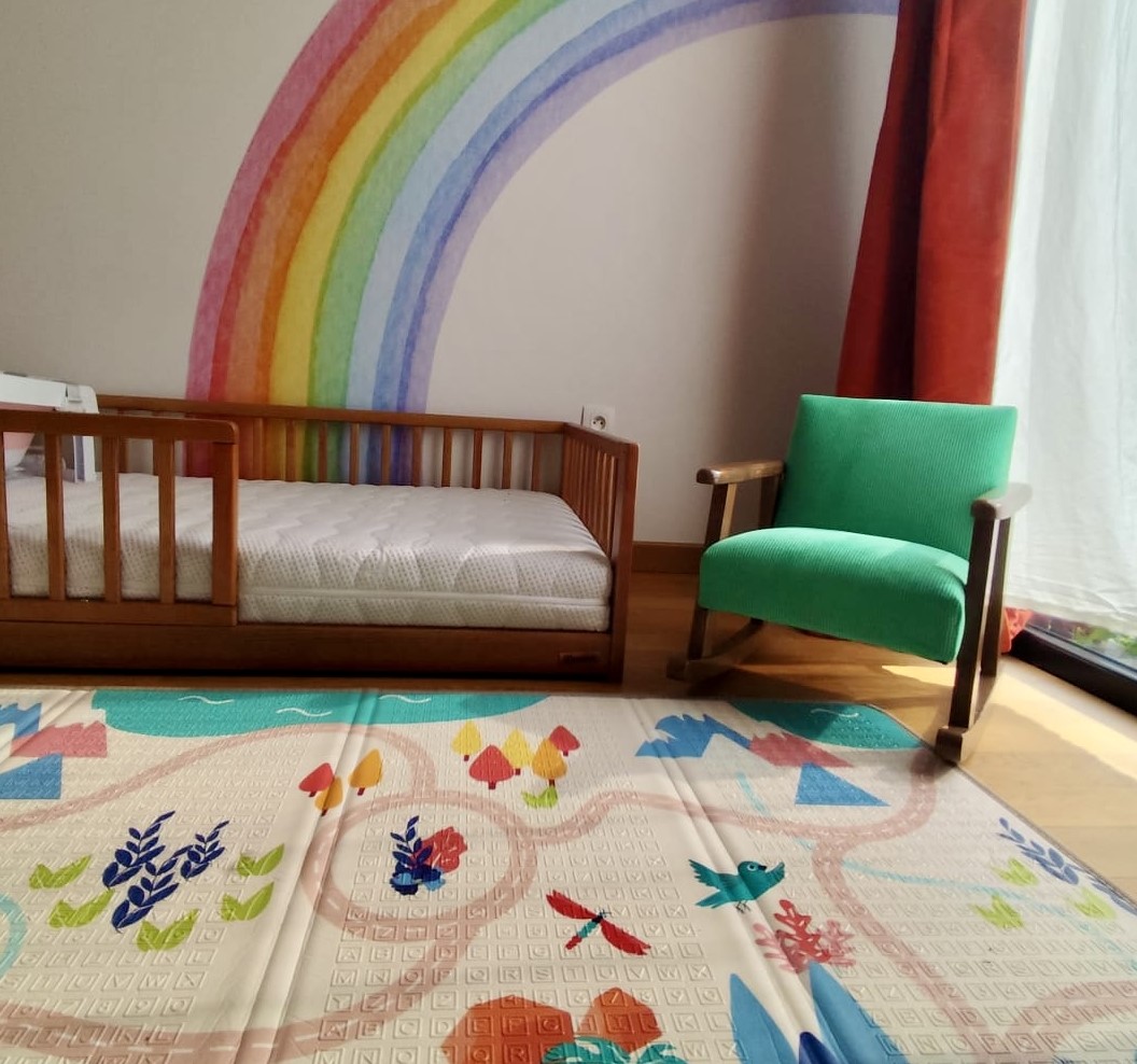 Rocking-chair rétro, restauration en mousse HR – tissu seconde main, peinture Libéron noir et bois ciré