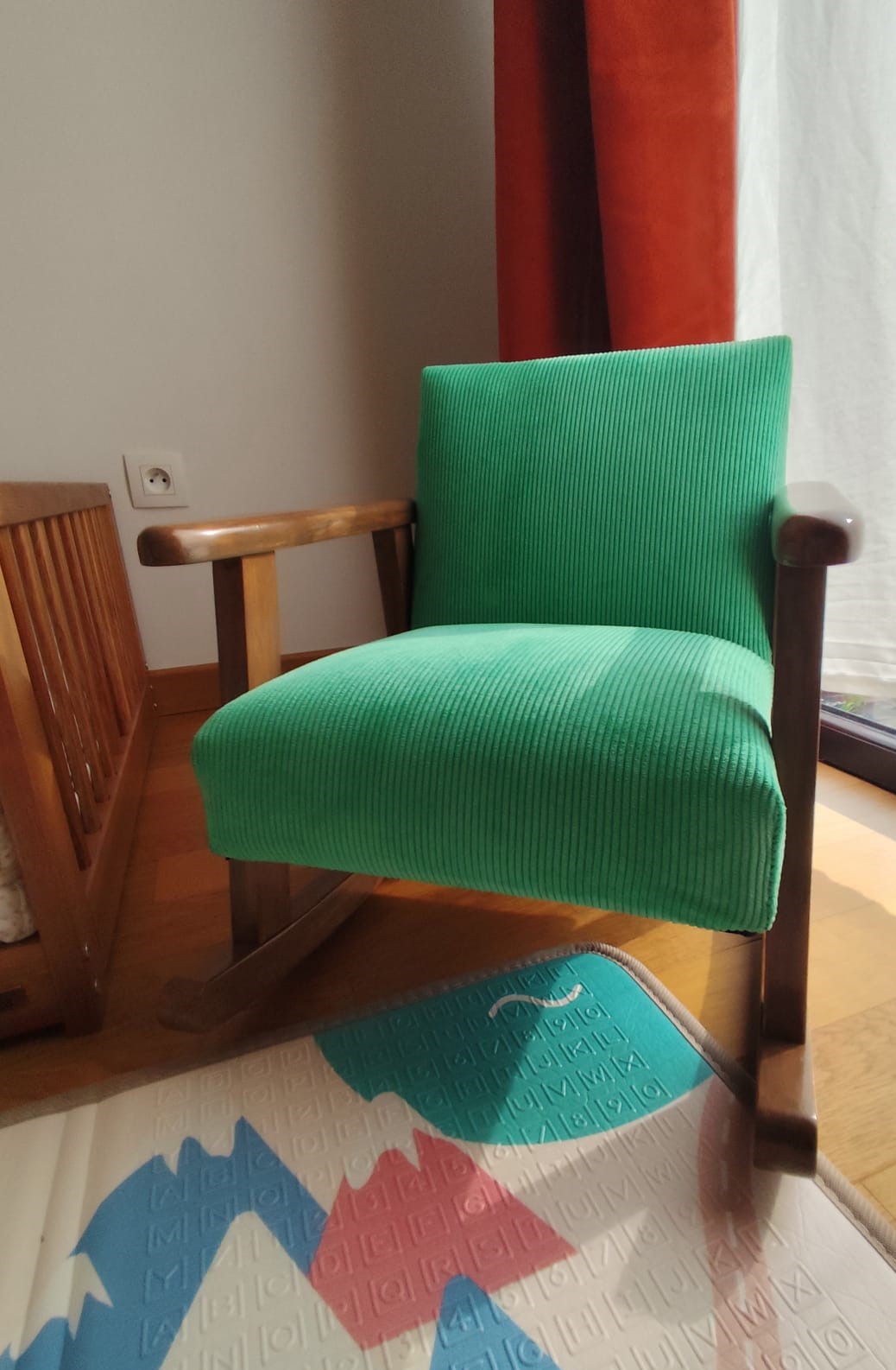 Ce rocking-chair rétro, a été restauré en mousse HR, revêtu d’un tissu seconde main,