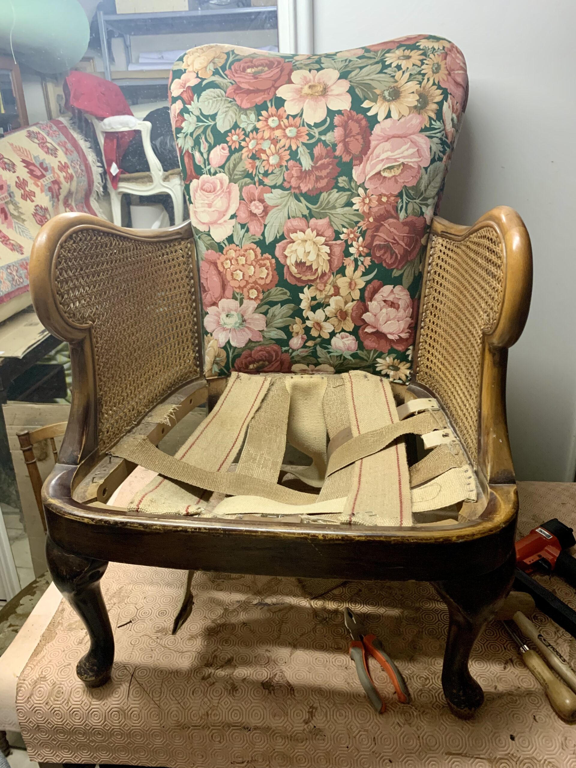 Réfection traditionnelle en crin & ressorts pour ce fauteuil crapaud