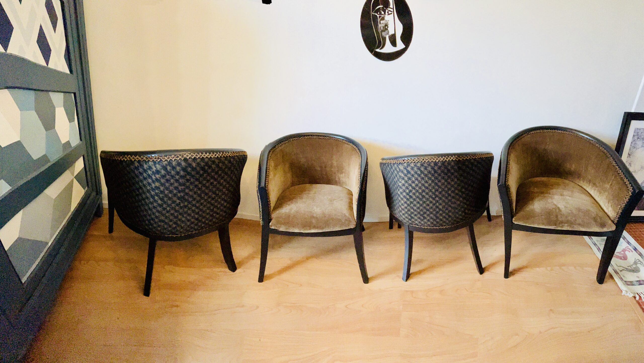Ces quatre fauteuils tonneaux ont connu une première vie dans un restaurant, où ils accueillaient clients et conversations avant d’être restaurés.